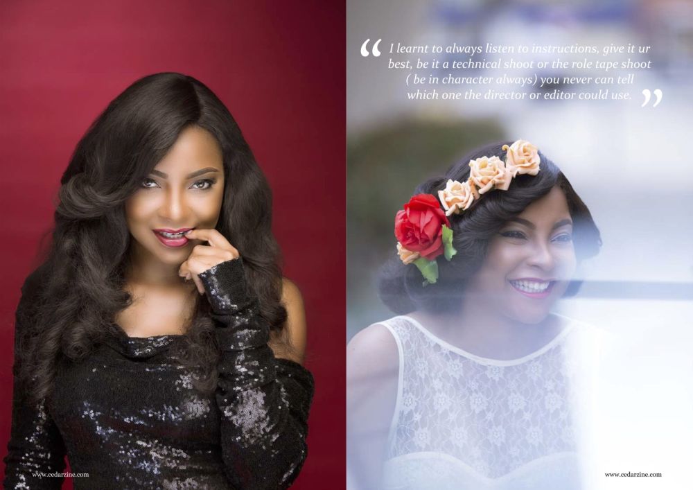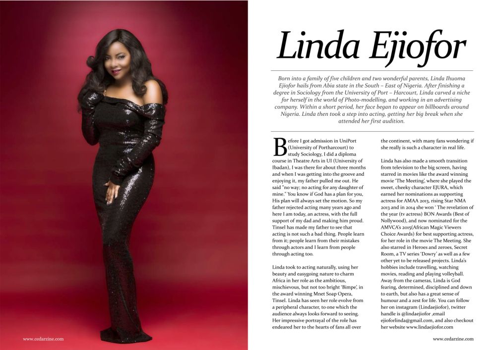The ever-so-pretty actress and Tinsel star, Linda Ejiofor is the cover girl for Cedar Magazine. The breath taking beauty stunned in a shimmery long black dress rocking soft curls elegantly.